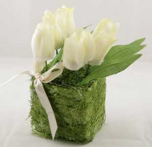 deliziosa scatolina porta confetti (si apre da sotto!) abbellita con tulipani sulla cima e ricoperta in paglia
