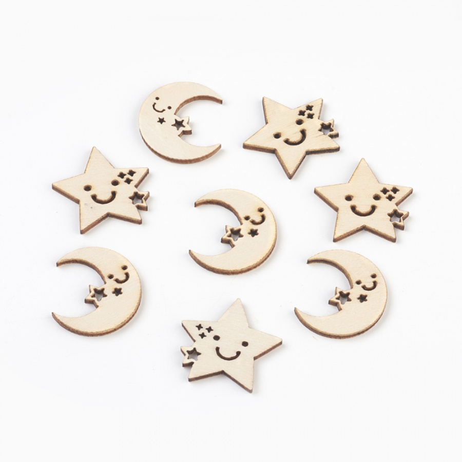 Bottoni in legno tondo, con intarsio inciso al laser. Forme variabili relative al cielo, stella, luna