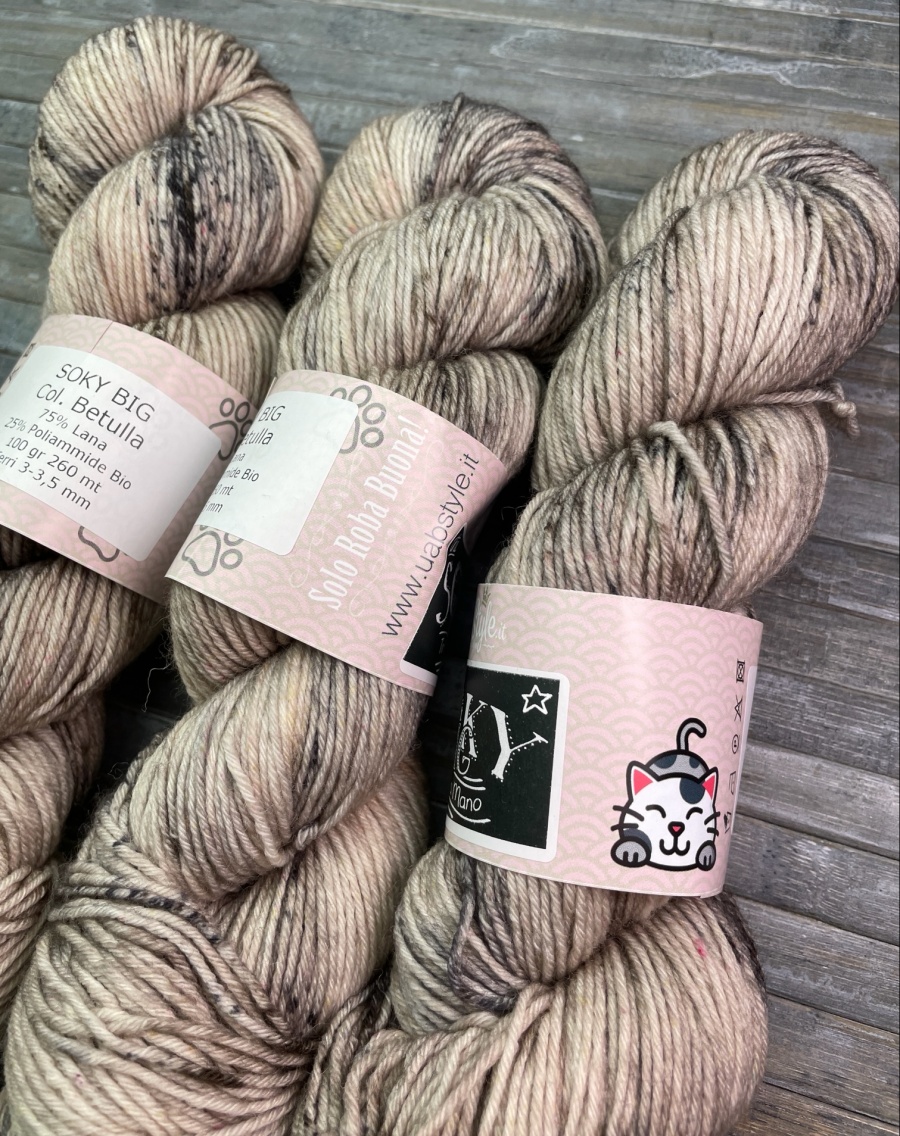 Filato tinto a mano, ogni matassa è unica ed originale. Tintura speckled, con le caratteristiche macchioline irregolari che lo rendono particolare. Filato morbido ma resistente, perfetto per maglie e scialli. Composizione: 75% Lana 25% Poliammide. Peso 100 grammi, 260 metri. 6 ply.